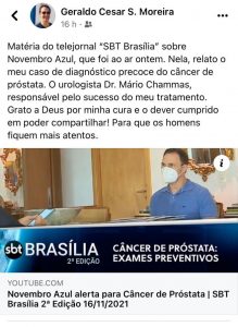 Em entrevista dada ao SBT Brasília, Sr. Geraldo Cesar S. Moreira, relatou seu caso de diagnóstico precoce do câncer de próstata e em sua postagem nas redes sociais, ele agradece ao Dr. Mário Chammas, urologista e membro do corpo clínico do Hospital Urológico de Brasília, pelo sucesso do seu tratamento…